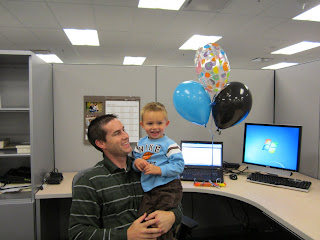 One row of cubicles decorated like the Wizard of Oz, complete with flying monkeys! I love how Brady doesn't realize I'm taking a video and not a still shot.